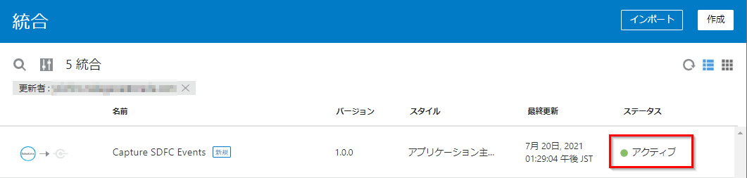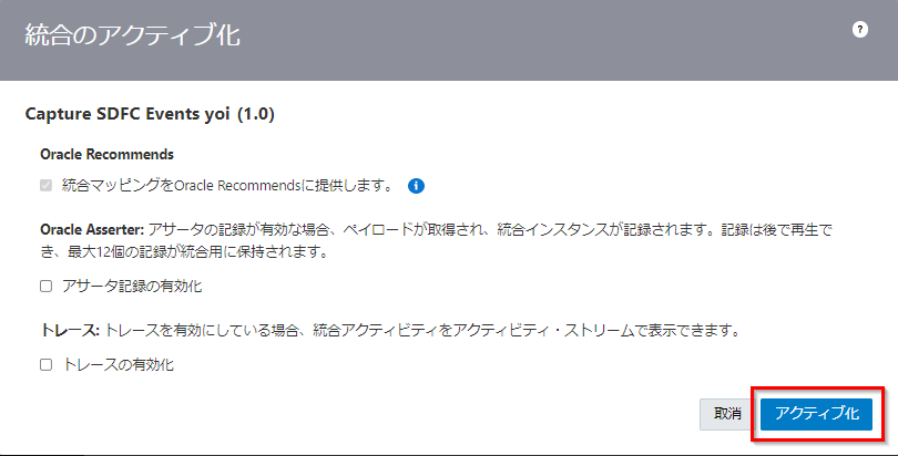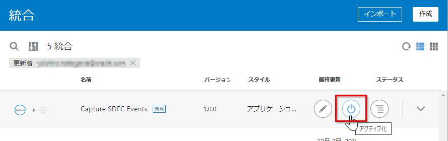 作成した Capture SFDC Events の上にマウスカーソルを合わせて、「アクティブ化」 をクリックします。