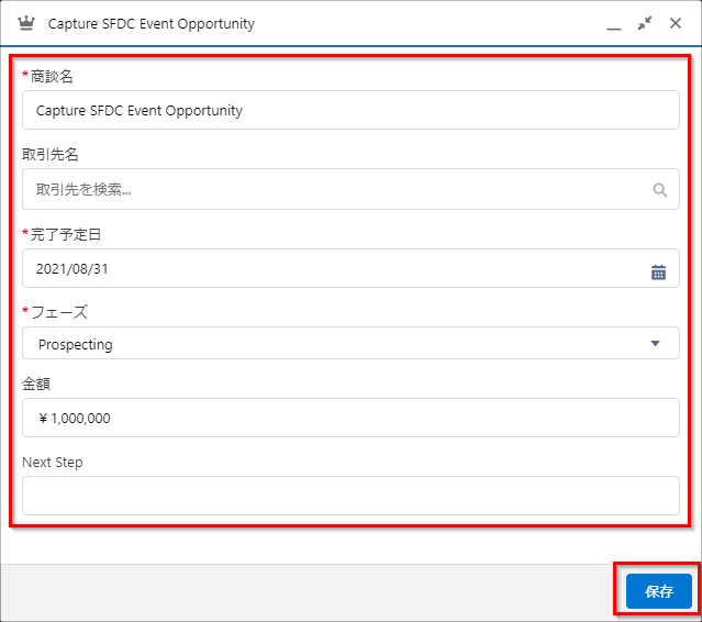 新規商談を1件作成します。以下の通りに入力し、「保存」 をクリックします。