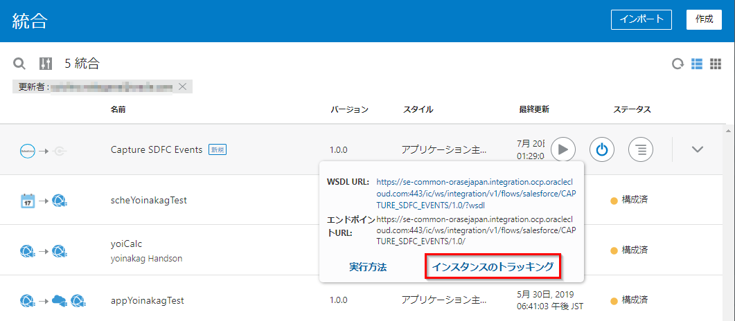 インスタンスのトラッキングは、OICホーム→モニタリング→統合→トラッキングよりアクセスできます。 {: .notice–info}