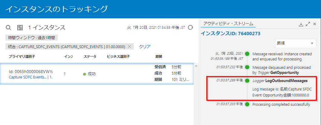 Capture SFDC Events の 「実行」→「インスタンスのトラッキング」 をクリックします。