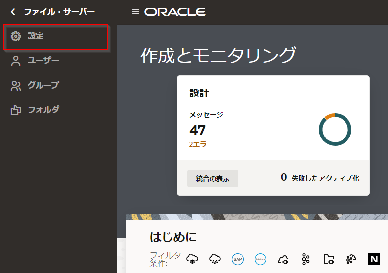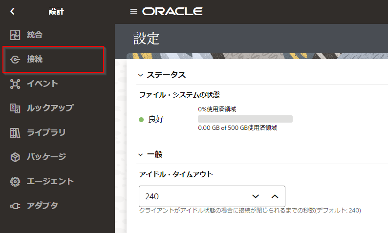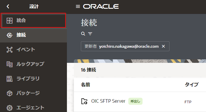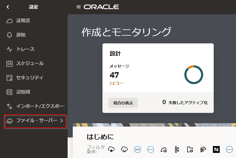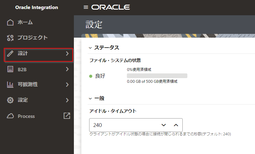 ファイル・サーバーの 「設定」 ページを開いている場合は、ナビゲーション・ペインの左上の 「<」 アイコンを2回クリックして、 「Oracle Integration」 メニューを表示させ、 「設計」 をクリックします。 {: .notice–info}