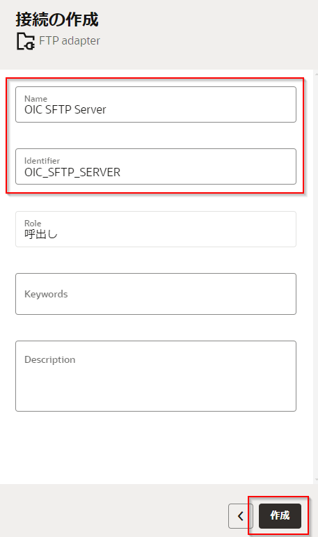 「識別子」 OIC_SFTP_SERVER (「名前」を入力すると自動的に設定されます)