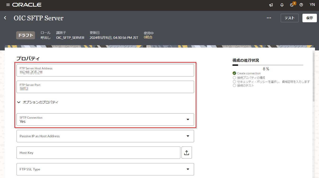 「FTPサーバー・ホスト・アドレス」 Oracle Integration Cloud 埋め込みファイル・サーバーの IP アドレスを入力
