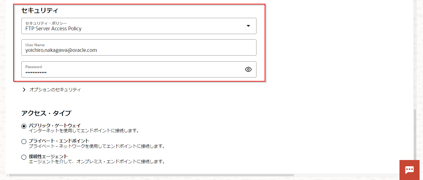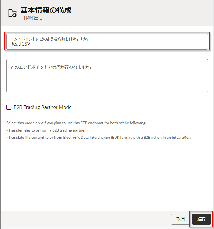 「FTPサーバー・ポート」 Oracle Integration Cloud 埋め込みファイル・サーバーのポート番号を入力