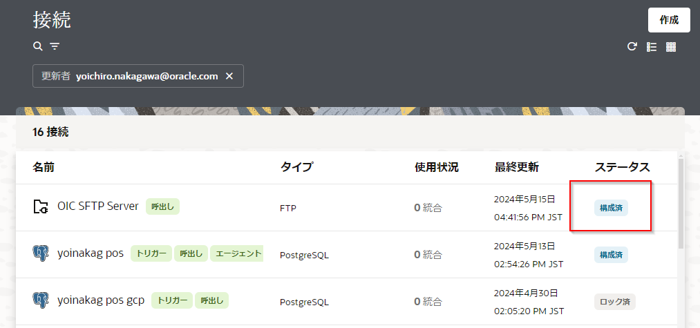 このチュートリアルでは、Oracle Integration Cloud 組み込みの SFTP ファイル・サーバーにアクセスするため、FTP アダプタに基づく接続を作成します。
