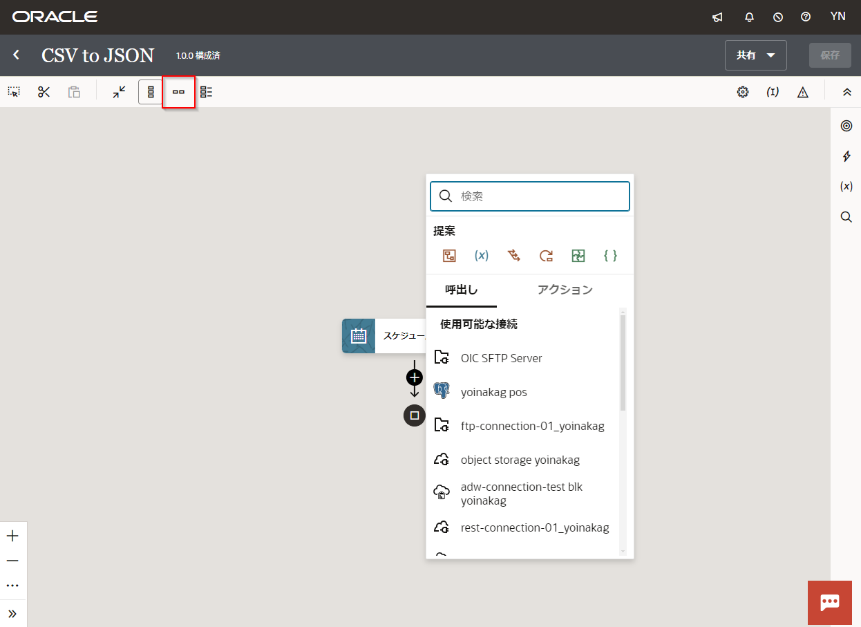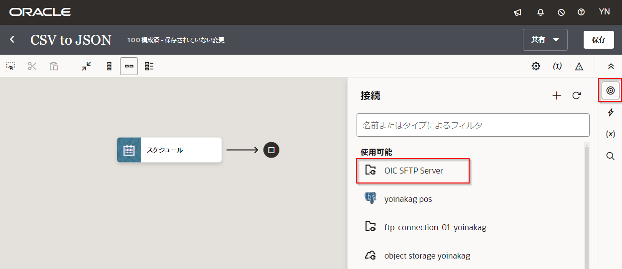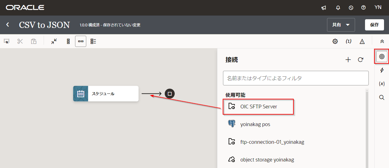ReadCSVを配置した手順と同様に右の呼び出し(◎のアイコン)から「OIC SFTP Server」をドラッグ・アンド・ドロップで配置することも可能です。 {: .notice–info}
