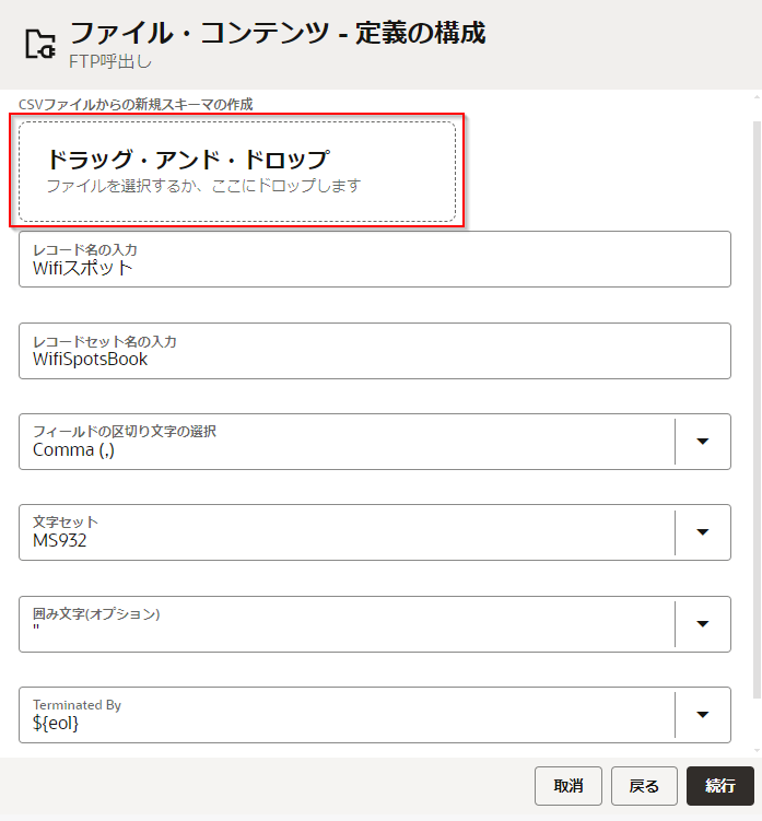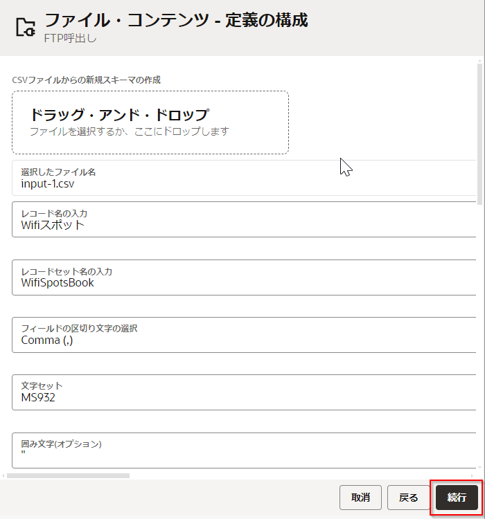 次に「スキーマの構成」 では、読取る CSV ファイルのデータの構造の指定方法を選択します。 次のように入力し、「続行」ボタンをクリックします。