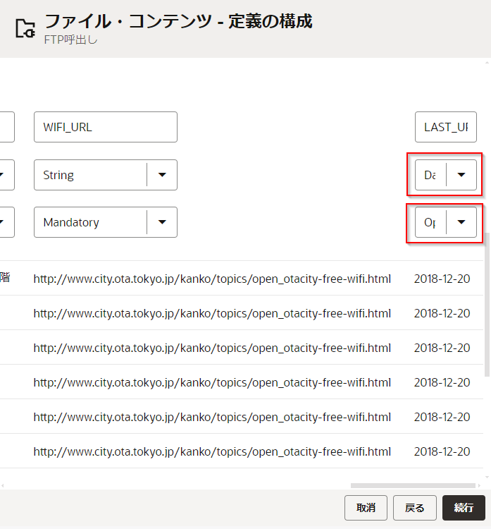 アップロードするとCSV ファイルの各列のデータの設定がダイアログの下の方にテーブル形式で表示されます。