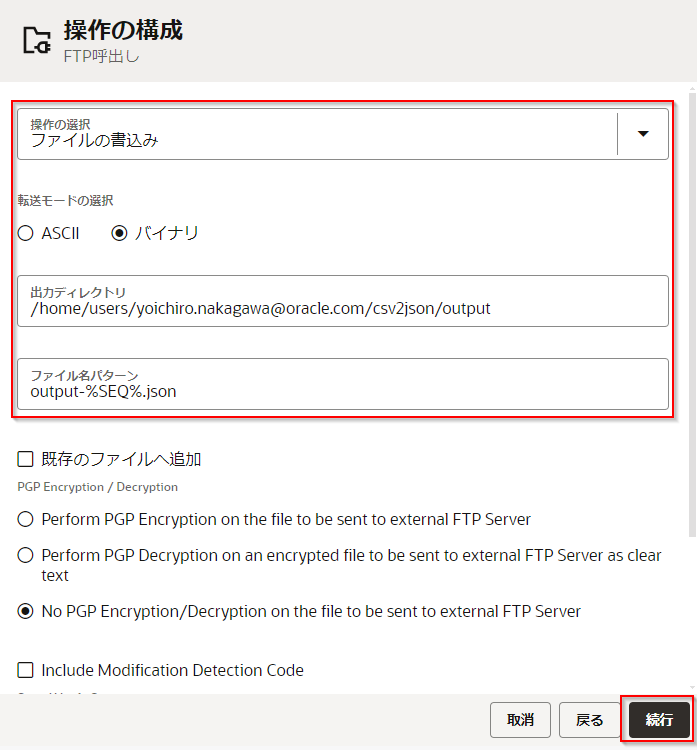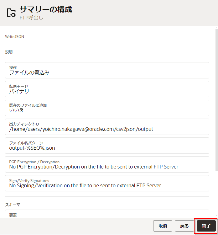 3. FTP アダプタ接続を使用して、ファイルサーバーに JSON ファイルを書込む設定を行う