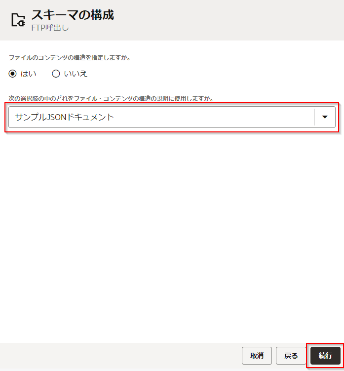 「次の選択肢の中のどれをファイル・コンテンツの構造の説明に使用しますか。」 「サンプルJSONドキュメント」 を選択