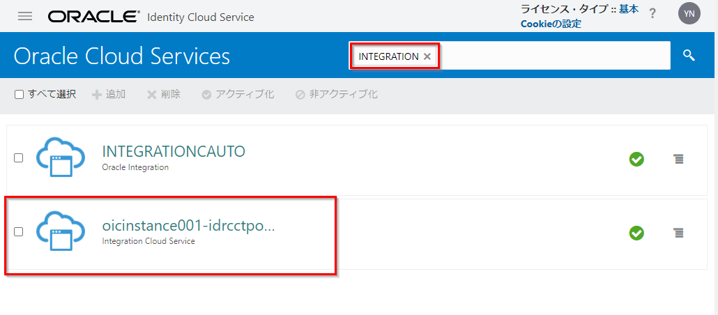 アプリケーションの検索窓に INTEGRATION と入力し、検索を実行します グループを割り当てる OIC インスタンスをクリックします