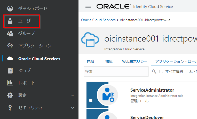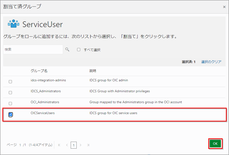 作成したIDCSグループ(OICServiceUsers)を、OIC の事前定義済ロール ServiceUser に割り当てます