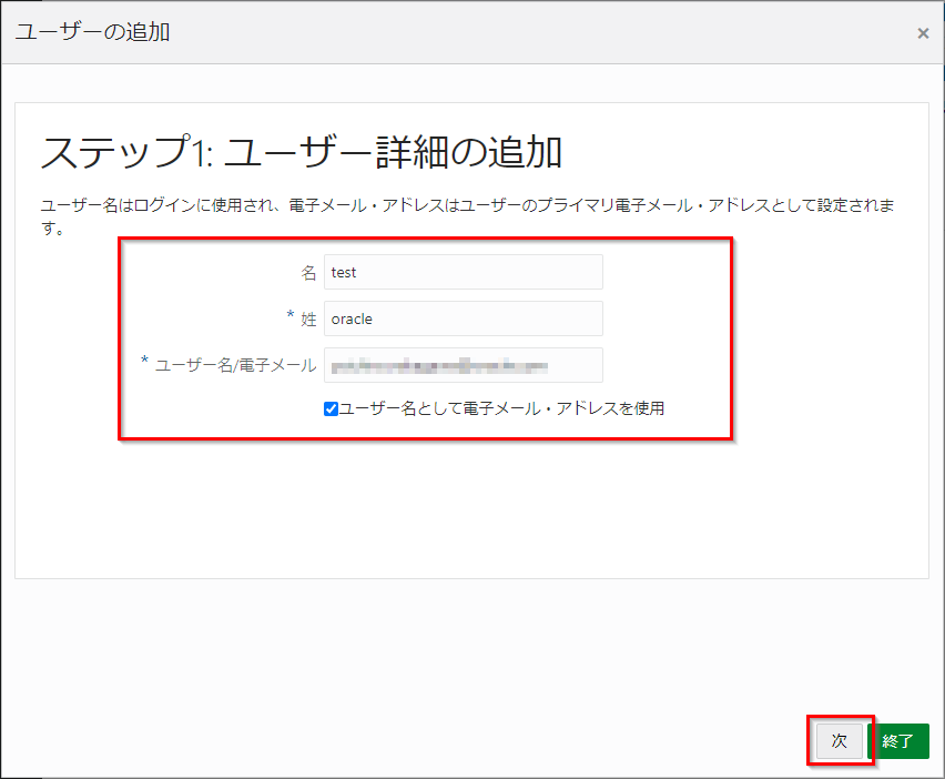 名、姓、ユーザー名/電子メールを入力し、次をクリックします