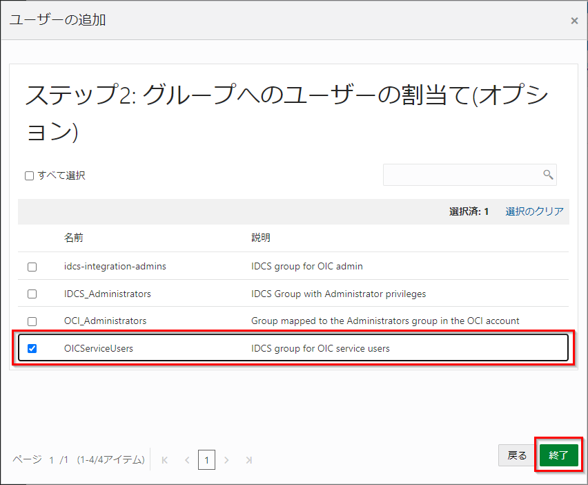 ユーザーに割り当てるグループを選択し、終了をクリックします。 ここでは OICServiceUsers グループを選択します