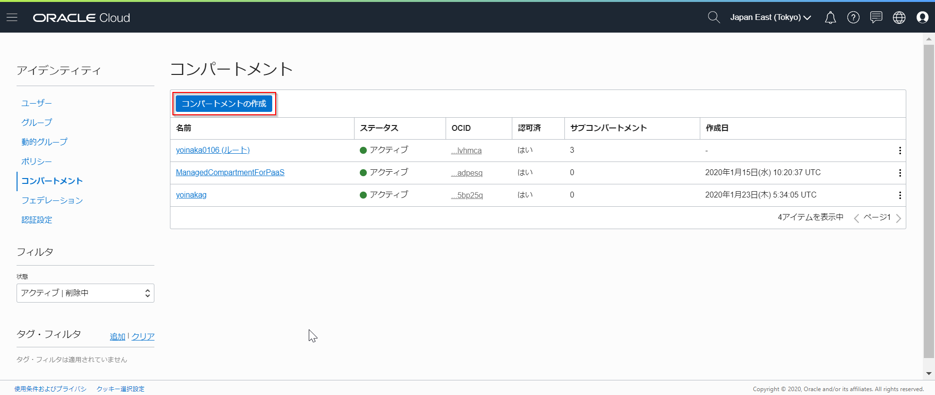 まず初めに、後ほど実施するVisual Builder Studioのセットアップで利用するコンパートメントを作成します。