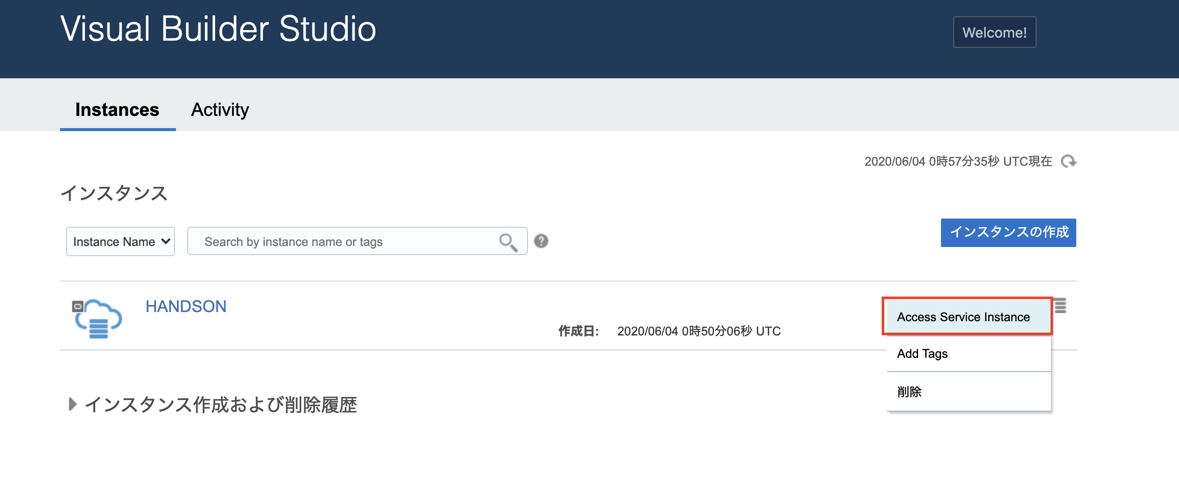 | Instance Name | Visual Builder Studioのインスタンス名。今回は"Handson” |
