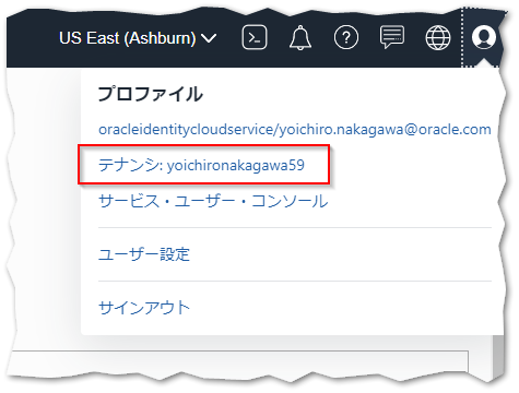 OCIコンソール画面右上の人型のアイコンをクリックし、展開したプロファイルから"テナンシ:<テナンシ名>“をクリックします。