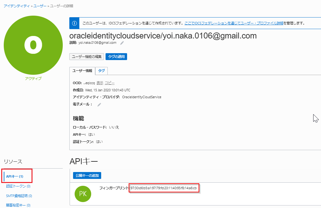 ユーザ情報が表示されますので、“OCID"の右側にある"コピー"をクリックすると、ユーザOCIDがクリップボードにコピーされます。