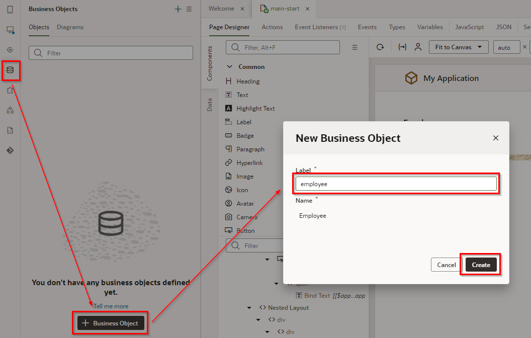 VBCSのコンソール画面へ遷移し、“Page Designer"から画面の任意の場所を編集します。今回はタイトルを"Employees"から"Employees List"へ変更します。
