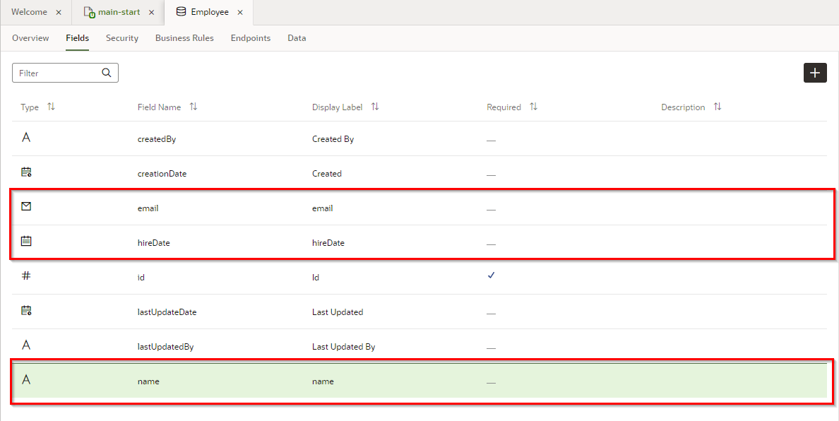 画面左の"Endpoint Structure"からname, hireDate, emailを選択し、“Next"をクリックします。