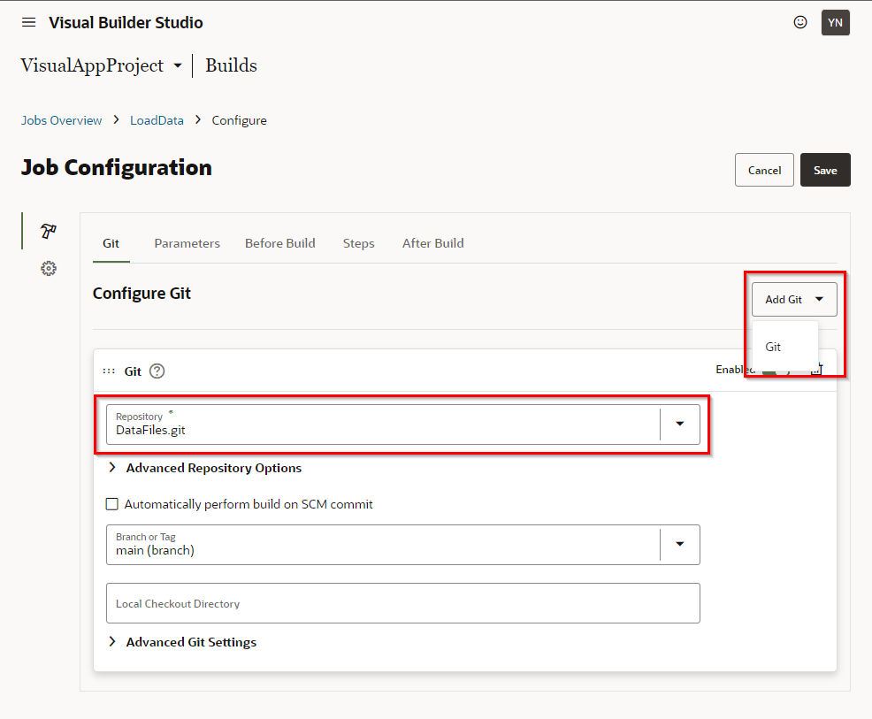 Job Configurationに遷移するので、Configure Gitで先ほど作成したレポジトリ"DataFiles.git"を設定します。