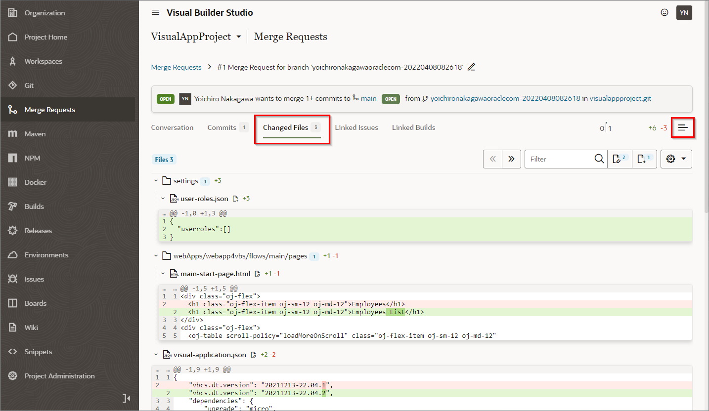 “Changed Files"から変更内容を確認し、問題なければ右にあるハンバーガーメニューをクリックします。