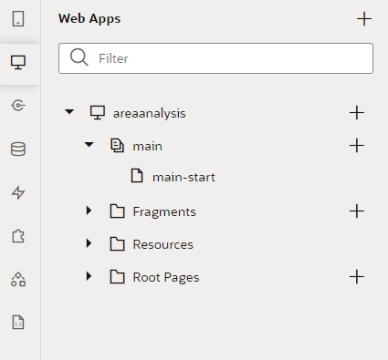 アーティファクト・ブラウザで 「areaanalysis」 ノードを展開するとWebアプリケーションの構造が表示されます。 「main」 ノードを展開すると 「main-start」 ページが表示されます。