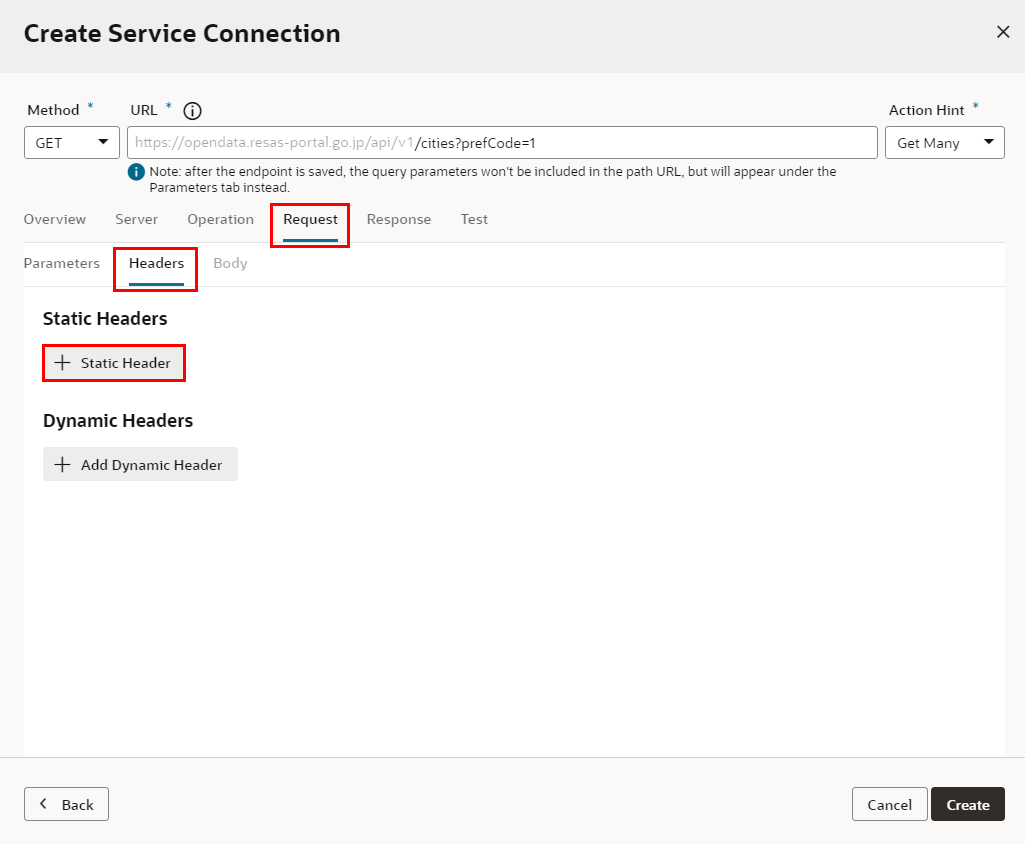 「Request」 タブ -> 「Headers」タブを開いて、「+ Static Header」ボタンをクリックします。