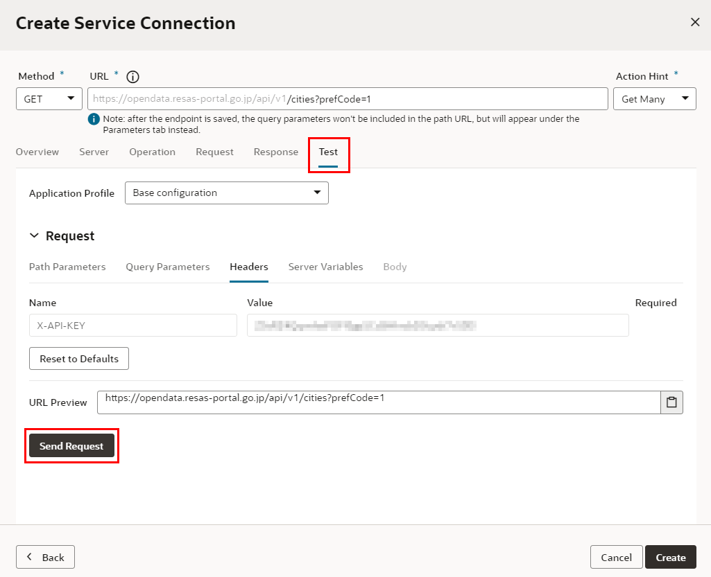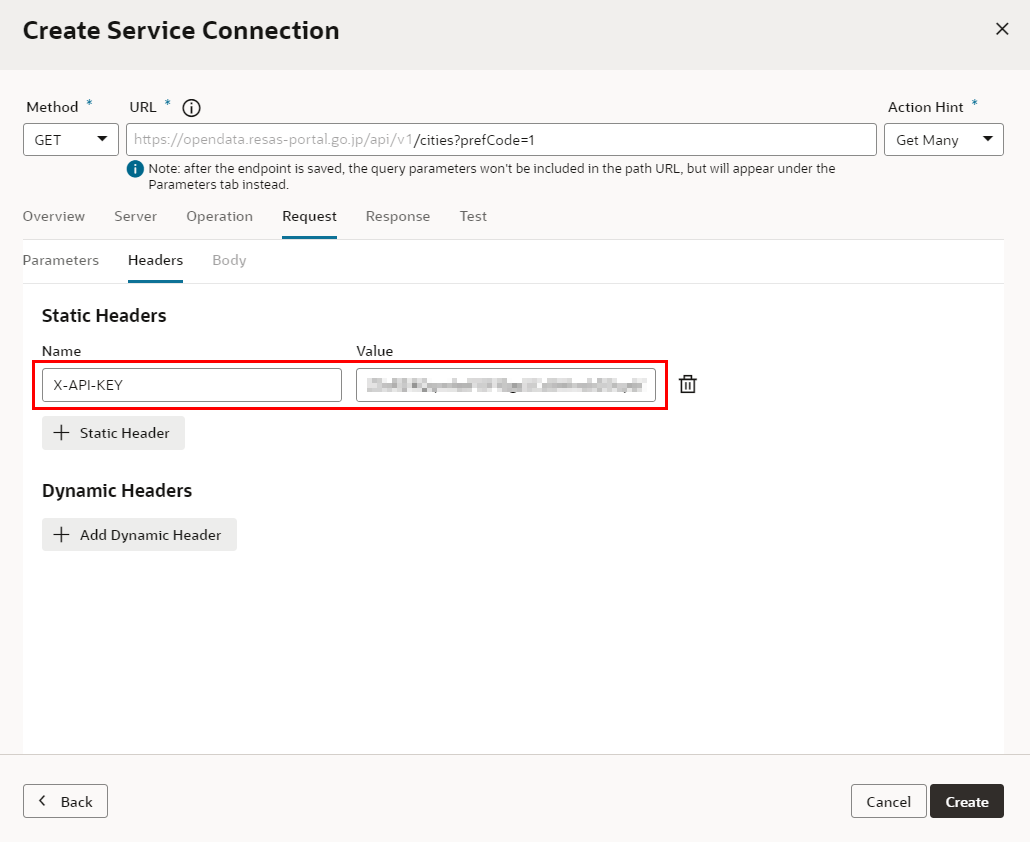 | 「Value」 | ご自身で取得したRESAS API KEY | 外部 REST サービスのリクエスト・ヘッダーの値 |