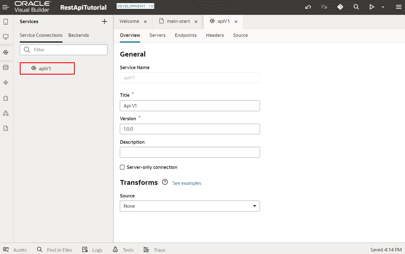 このパートでは、前のパートで作成したビジュアル・アプリケーションにサービス接続を作成します。 サービス接続を作成することにより、外部 REST サービスの呼び出しをコーディングなしに設定することが可能です。