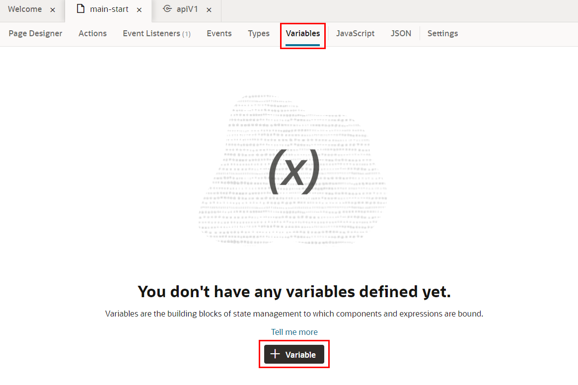 アプリケーション・デザイナの Variables タブをクリックします。 「+ Variable」 ボタンをクリックします。