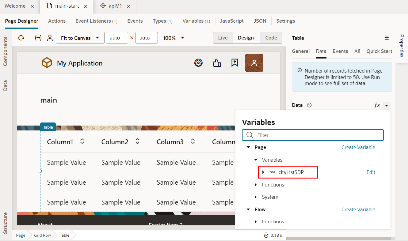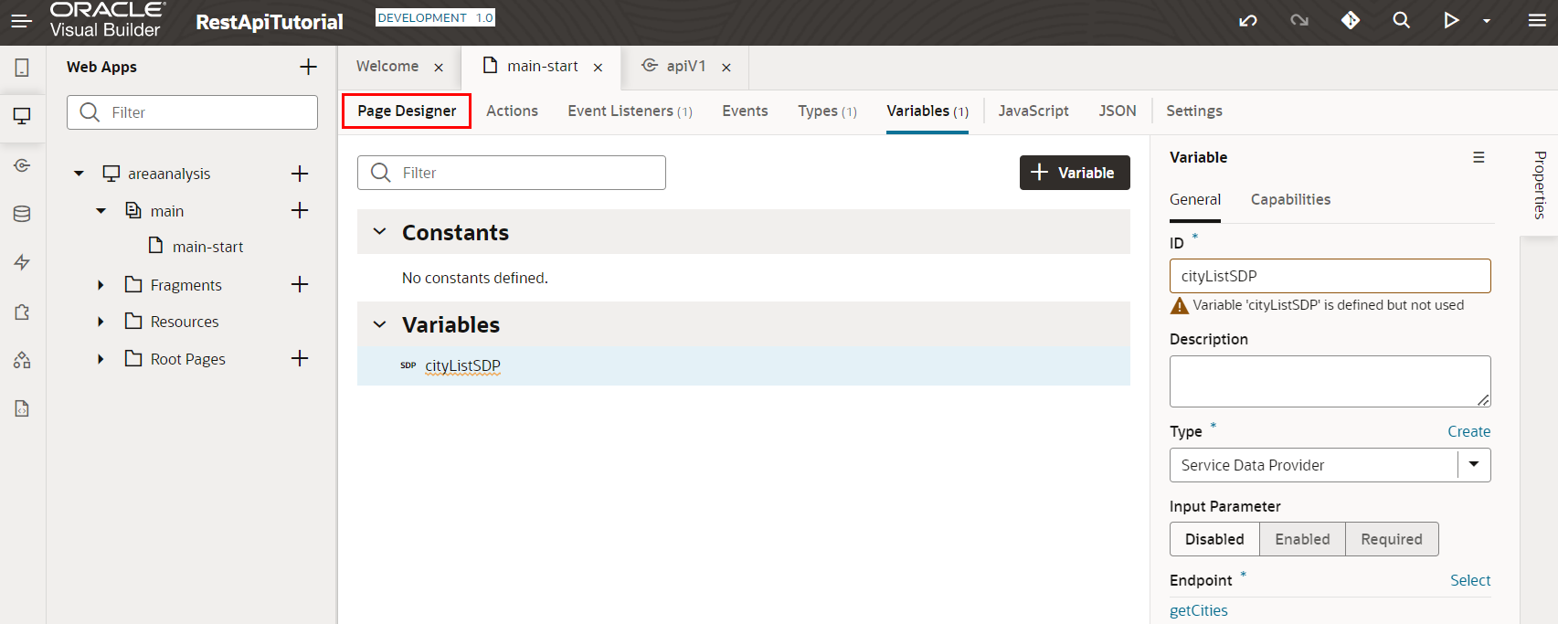 変数「cityListSDP」が作成され、アプリケーション・デザイナで表示されます。プロパティ・インスペクタで、 「Select Endpoint」 ボタンをクリックします。