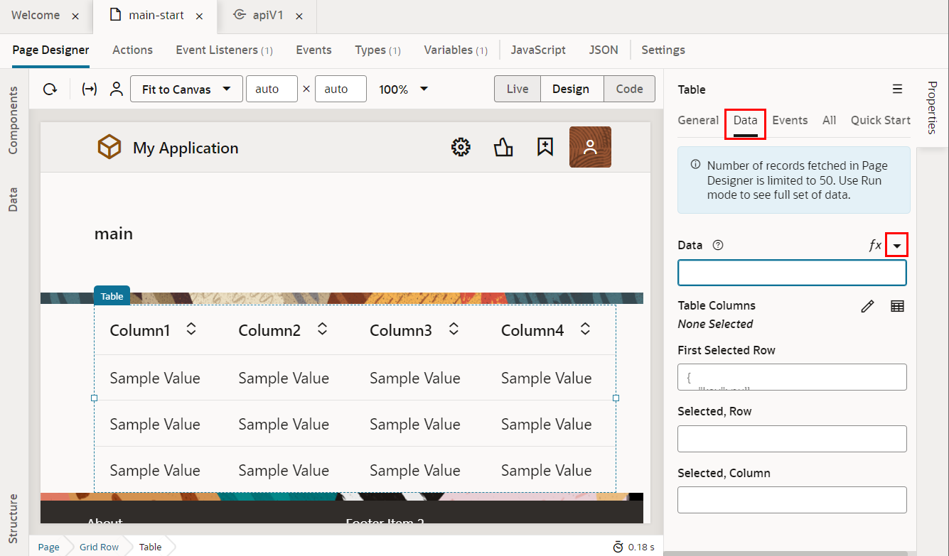 アーティファクト・ブラウザの 「Web Applications」 タブ を開きます。 「main」 ノードを展開し、「main-start」 をクリックします。 アプリケーション・デザイナで main-start ページが表示されます。