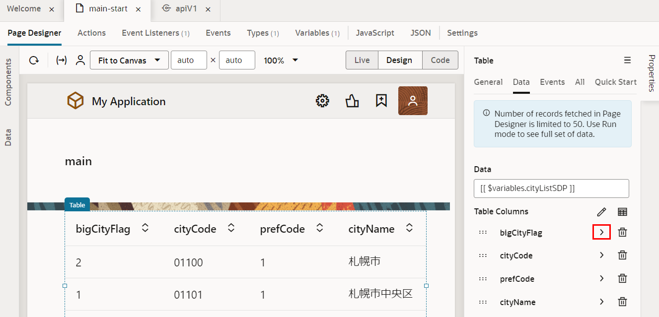 テーブルの列ヘッダーのテキストを変更します。「Table Columns」 リストの上から一番目の 「bigCityFlag」 の「>」をクリックして「Columns, Header Text」から 「特別区・行政区フラグ」 に変更し、「Columns, Sortable」から「Disabled」に変更します。